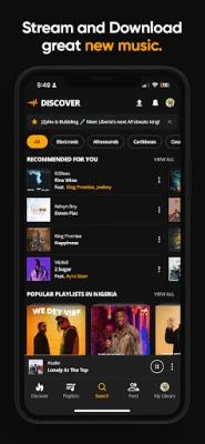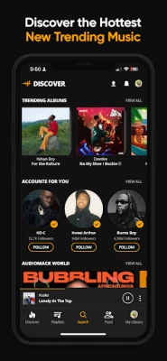 Tare da Audiomack, ba za ka taɓa rasa abin da ke faruwa a duniyar kiɗa ba. Sashenmu na "Trending" yana nuna maka sabbin waƙoƙi da albam masu tashe, yana mai ba ka damar zama na farko a cikin abokanka da zai san sabbin abubuwa. Ba wai kawai za ka iya sauraron sabbin kidaje ba, har ma za ka iya kunna tarin waƙoƙin MP3, WAV, M4A, AAC, da sauran fayilolin kiɗa na gida daga cikin app ɗin. Ji daɗin sauraro da bibiya mara iyaka na Hip-Hop, Afrobeat, Reggae, da sauran nau'ikan kiɗa da kake so.
