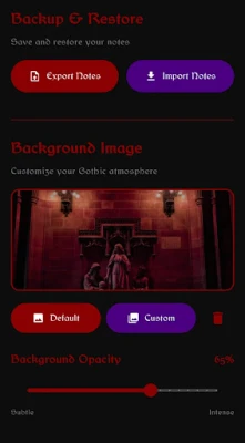 Gothic Notes yana ɗaukar sirrinka da mahimmanci: dukkanin bayanan kula naka suna zama a kan na'urarka, ba tare da wani haɗin girgije ba, bibiya, ko raba bayanai ba. Aikin sa na gaba ɗaya ba tare da intanet ba yana nufin cewa tunaninka yana zaune a tsare har abada. Baya ga sirri, Gothic Notes yana ba ka damar keɓance rubuce-rubucenka tare da zaɓi na musamman na rubutun Gothic da sauran salo kamar Chomsky, Balgruf, da Medieval Sharp. Gudanar da bayanan kula ma yana da sauƙi: ƙirƙira, gyarawa, sharewa, da bincika bayanan kula ba tare da wata wahala ba. Don ƙarin aminci, manhajar tana ba da damar ajiya da maido da bayanai, inda za ka iya fitar da bayanan naka a matsayin fayilolin JSON don adana su ko canja su zuwa wata na'ura. Yana da mahimmanci a lura cewa yayin da fayilolin JSON ke adana rubutu da tsarin rubutu, hotuna da bidiyo ba a haɗa su kai tsaye ba; kawai an adana nassosinsu. Fayilolin kafofin watsa labarai suna zaune a cikin gida a kan na'urarka, saboda haka muna ba da shawarar adana su daban ko amfani da tsarin ajiya na na'urarka don cikakken kiyaye bayanai.
