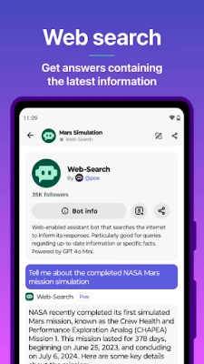 Faɗaɗa tunaninka ta hanyar tattaunawa da basirar hira da yawa a lokaci guda, inda zaka iya kwatanta martani ko haɗa nau'ukan daban-daban don cimma burinka a cikin tattaunawa guda ɗaya. Haka kuma, Poe yana da injin bincike mai amfani da AI wanda ke amfani da ingantacciyar fasahar sarrafa harshe da binciken yanar gizo don baka sakamako mai dacewa da sauri. Ba a nan kadai ba, Poe yana juyar da tunaninka zuwa hotuna da bidiyoyi masu ban mamaki nan take, ta amfani da injinan kirkira na zamani irin su FLUX1.1, Ideogram 2.0, Stable Diffusion 3.5, Veo 2, da Dream Machine, suna ba ka damar kirkirar abubuwan gani da sauti masu kayatarwa ba tare da wata wahala ba.